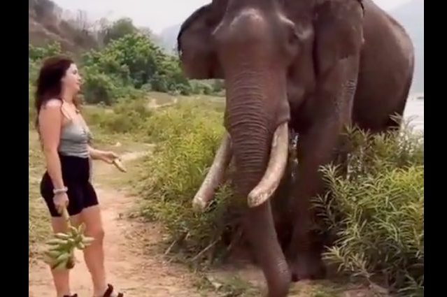 Le immagini mostrano la donna che attira verso di sé l’elefante con una banana mettendogli il frutto davanti alle fauci ma levandoglielo proprio nel momento in cui lui sta riuscendo ad addentarlo provocando la sua risposta inaspettata: con la proboscide e le zanne, infatti, il pachiderma spinge via la turista scagliandola a terra.