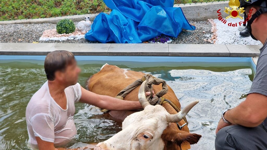 Il livello dell’acqua non era fortunatamente alto, e l’animale è riuscito a tenere la testa fuori. Quando il suo umano di riferimento si è reso conto di cosa era accaduto ha subito chiamato i soccorsi, consapevole che per tirarla fuori dalla piscina sarebbe stato necessario un intervento specializzato. E così sul posto, oltre ai Carabinieri e alla Polizia, sono arrivati anche i Vigili del fuoco, che hanno assicurato la mucca a un’imbracatura fatta con corde e fasce e l’hanno lentamente sollevata mentre l'allevatore dall'interno della piscina la sospingeva delicatamente.