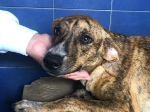 Nonostante le prime diffidenze, il cucciolo ha lasciato il canile felice, e appena in auto si è completamente rilassato sul tappetino.