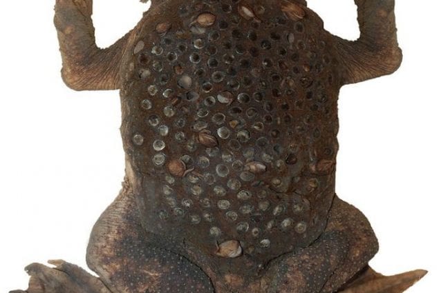 Il rospo del Suriname è una specie che vive in Sud America, il cui punto forte senza dubbio non è la bellezza, ma vi sorprenderà invece per la sua stranezza. La particolarità infatti sta nel comportamento riproduttivo: durante la riproduzione il maschio inserisce nella schiena della femmina le uova, letteralmente inglobandole nel suo corpo, le quali affondando sempre di più nella carne, matureranno fino a schiudersi e fuoriuscire come piccoli rospi, in una sorta di scena dell'horror. La schiena della femmina appare quindi come fosse tutta bucherellata, non un grande spettacolo per chi soffre di tripofobia.
