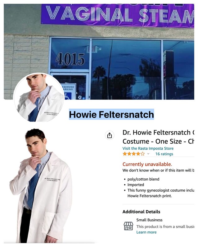 Proprio dal suo profilo partiamo per capire quanto di vero ci sia nell’annuncio condiviso (nulla). Howie Feltersnatch è infatti un nome fittizio, e la foto profilo di Facebook, che mostra un giovane con camice bianco e targhetta che riporta nome e qualifica (ginecologo) è presa direttamente da Amazon, utilizzata per pubblicizzare un “costume da Dr. Howie Feltersnatch”. L’Howie Feltersnatch di Facebook ha 3 account su Facebook, 13 follower e si definisce “ginecologo freelance”. La foto di copertina mostra l’entrata di un centro che offre un trattamento di “vaginal streaming”, letteralmente “fumenti vaginali”. Il centro in questione si chiama Hooha V-Spa LLC e si trova a Las Vegas, in Nevada, che si trova a circa 2.400 chilometri da Beaumont, la cittadina in Texas cui è dedicato il gruppo di acquisto creato su Facebook in cui è stato postato l’annuncio. Anche qui: nulla di verosimile.