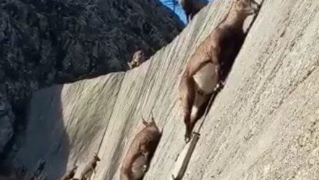 Il video degli stambecchi che si arrampicano lungo la parete per leccare il sale